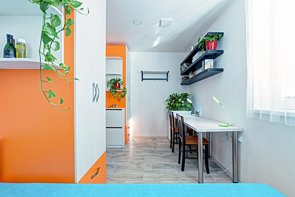 Pokoj pro jednotlivce v přízemí. Na pokoji je velká šatní skříň, postel s kvalitní matrací, stůl s kancelářskou židlí, botník, věšáky, několik poliček a lampiček a lednička s mrazákem. Koupelna s kuchyňkou, kterou sdílí nejvýše 3 bydlící společně z pokojů Amsterdam a Boston, jsou na chodbě hned naproti pokoji.