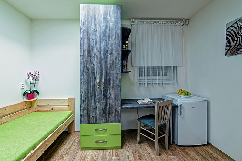 Každý bydlící má k dispozici vlastní velkou vestavěnou skříň.