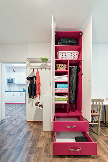 Každý bydlící má k dispozici vlastní velkou vestavěnou skříň.