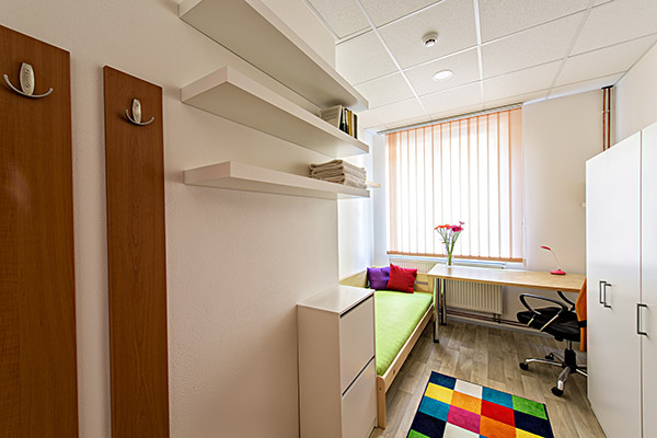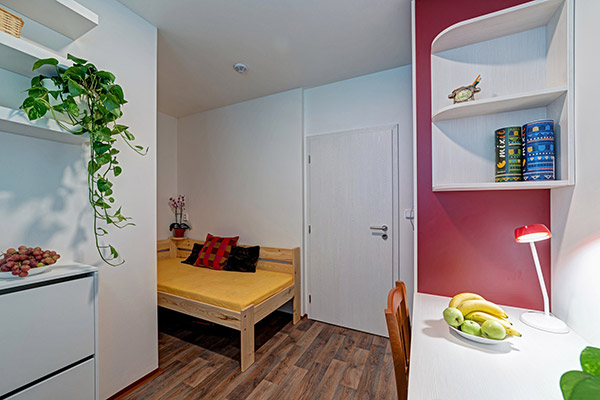 Pokoj pro jednotlivce v přízemí. Na pokoji je velká šatní skříň, postel s kvalitní matrací, stůl s kancelářskou židlí, botník, věšáky, několik poliček a lampiček a lednička s mrazákem. Koupelna s kuchyňkou, kterou sdílí nejvýše 3 bydlící společně z pokojů Amsterdam a Boston, jsou na chodbě hned naproti pokoji.