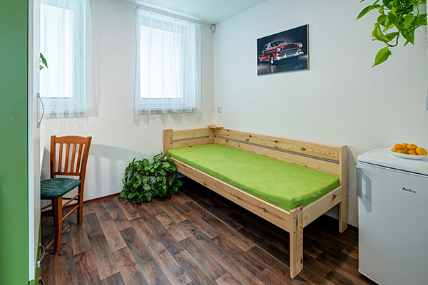 Tento apartmán je určený pro jednotlivce. Je standardně vybaven zvýšenou postelí, ledničkou, vestavnou skříní a stolem se židlí. Zajímavostí tohoto pokoje je dvojice oken na východ do parku, což tomuto apartmánu dává velmi příjemné proslunění, obzvláště dopoledne. Kuchyně a koupelna je společná se dvěma sousedními pokoji, celkem tedy maximálně pro 4 osoby.