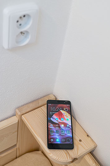 U každé postele je připravená elektrická zásuvka a polička pro nabíjení mobilu.