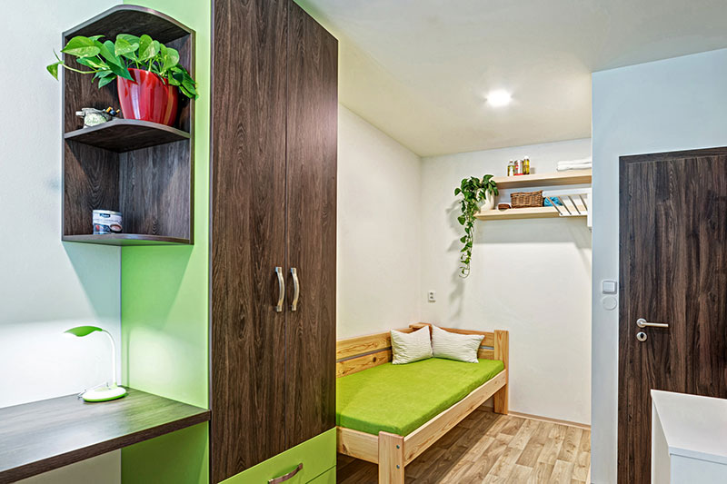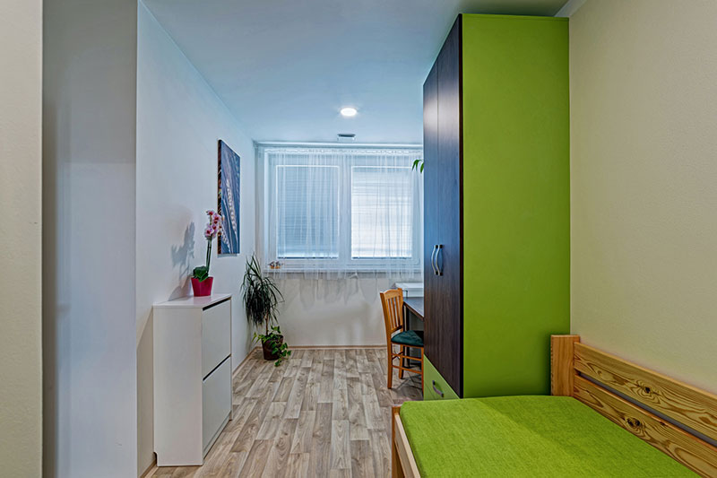 Každý bydlící má k dispozici vlastní velkou vestavěnou skříň.