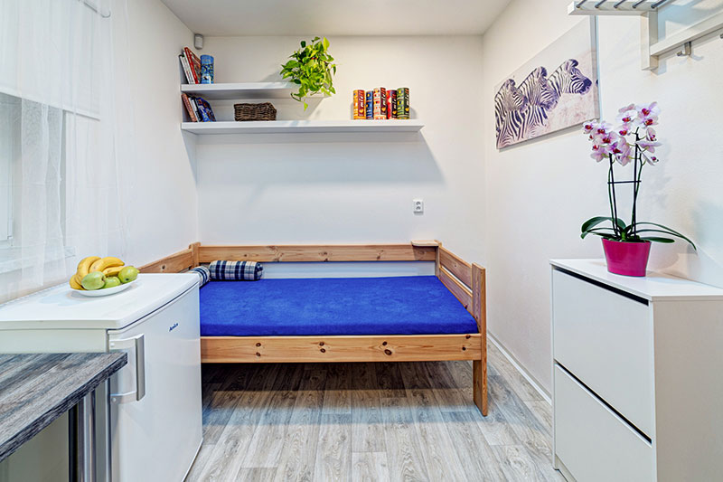Apartmán pro jednoho hosta s oknem do západní uličky mezi domy. Pokoj má velký střešní světlík, který mu dodává nadprůměrnou vzdušnost. Pokoj je standardně vybaven postelí, vestavnou skříní se stolem a ledničkou. Káhira je umístěná ve větším bytě, kde spolu se třemi dalšími pokoji sdílí kuchyň, koupelnu s WC a druhé samostatné WC, určené celkem pro 6 bydlících.