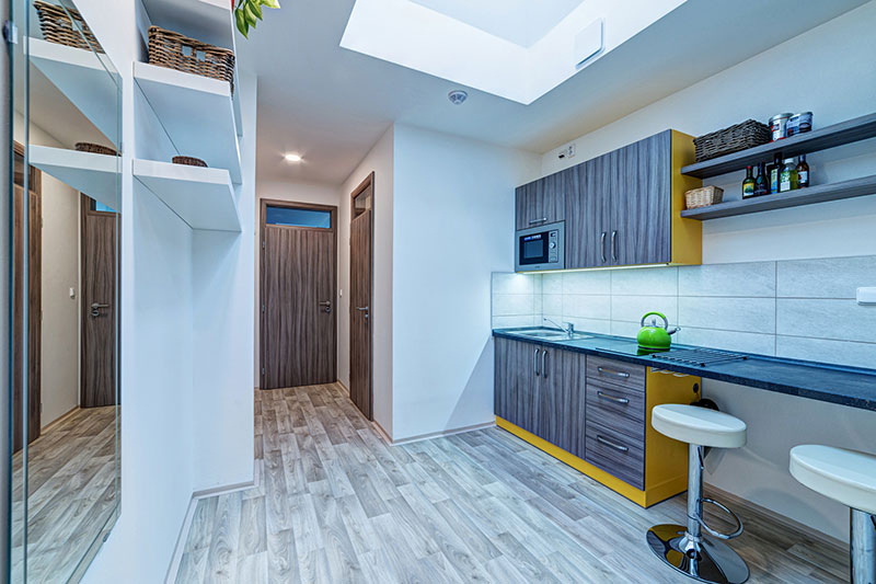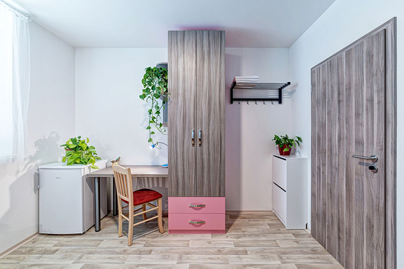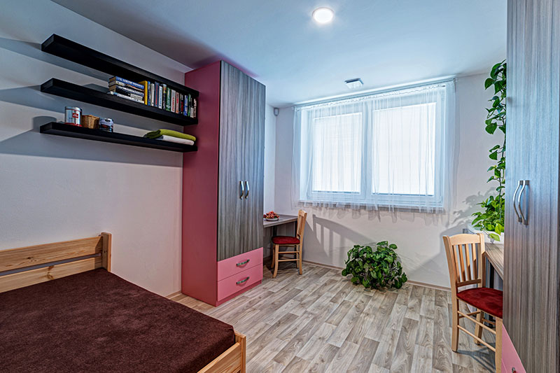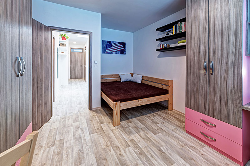 Každý bydlící má k dispozici vlastní velkou vestavěnou skříň.